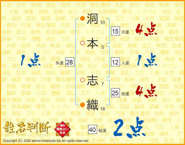 洞(10画)本(5画) 志(7画)織(18画)