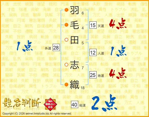 羽(6画)毛(4画)田(5画) 志(7画)織(18画)