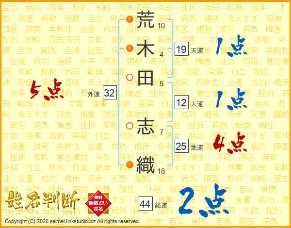荒(10画)木(4画)田(5画) 志(7画)織(18画)