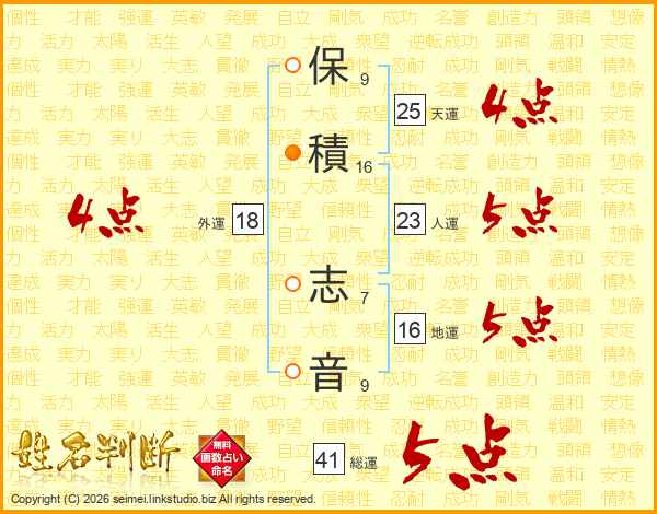 生活面を象徴する運勢です。外部から受ける影響力を表し、結婚運、家庭運や職場、環境への順応性を表します。総運から人運を引いた画数。姓や名が1文字の場合を除く。