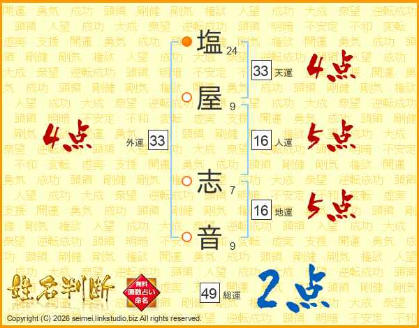 塩(24画)屋(9画) 志(7画)音(9画)