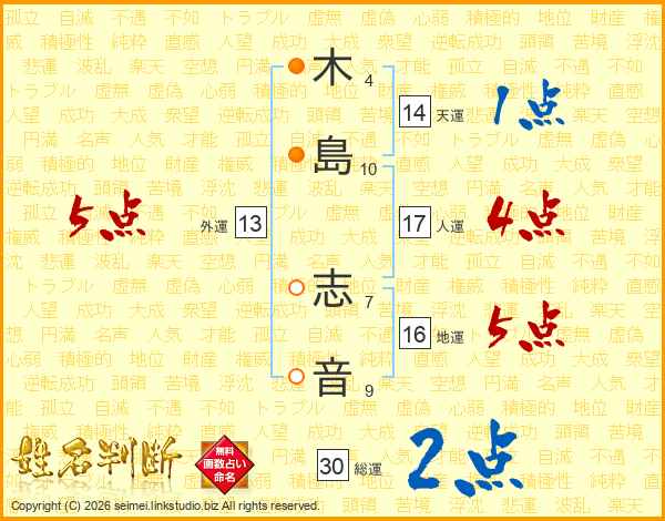 あなたの人生を表す1番重要な運勢です。生涯を通じて影響する総合運となり、主に50歳以降の晩年期に影響を及ぼします。苗字と名前の合計画数。