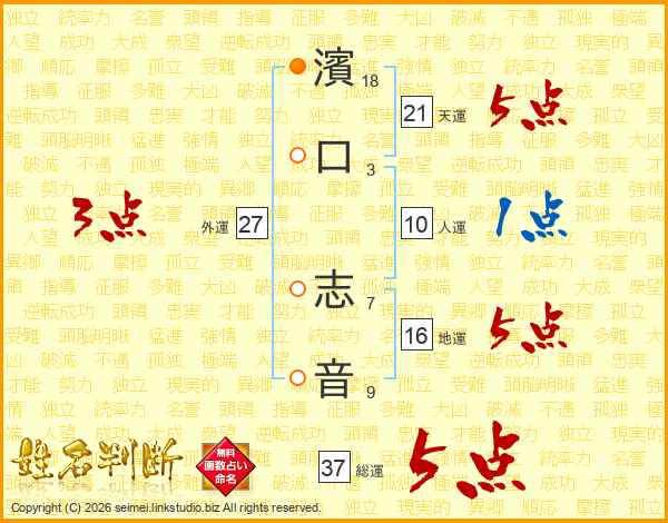 画数の奇数(○陽)と偶数(●陰)の配列で吉凶を占います。どちらかにかたよる名前は大凶名で避ける必要があります。画数の奇数偶数。