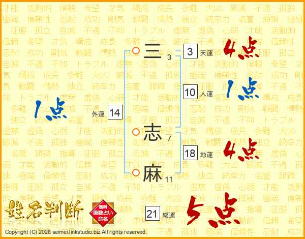 あなたの人生を表す1番重要な運勢です。生涯を通じて影響する総合運となり、主に50歳以降の晩年期に影響を及ぼします。苗字と名前の合計画数。