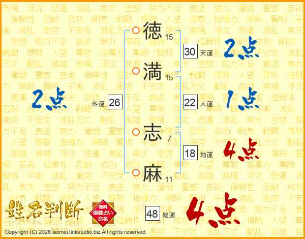 徳(15画)満(15画) 志(7画)麻(11画)