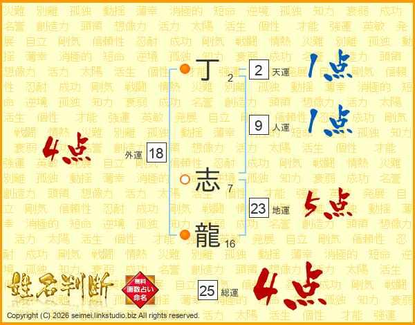 家系が持つ宿命的な運勢を表します。祖先から受け継いだ苗字ですので自分の力が及びません。家柄を象徴します。苗字の合計画数。
