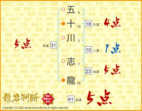 あなたの人生を表す1番重要な運勢です。生涯を通じて影響する総合運となり、主に50歳以降の晩年期に影響を及ぼします。苗字と名前の合計画数。