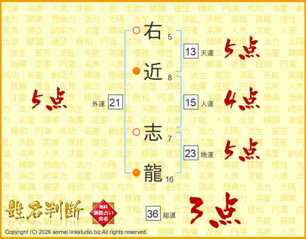 あなたの人生を表す1番重要な運勢です。生涯を通じて影響する総合運となり、主に50歳以降の晩年期に影響を及ぼします。苗字と名前の合計画数。