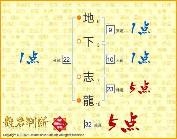 あなたの人生を表す1番重要な運勢です。生涯を通じて影響する総合運となり、主に50歳以降の晩年期に影響を及ぼします。苗字と名前の合計画数。