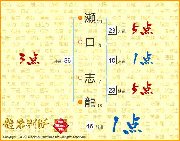 瀬口志龍さんの総運は46画の1点!