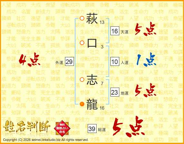 あなたの人生を表す1番重要な運勢です。生涯を通じて影響する総合運となり、主に50歳以降の晩年期に影響を及ぼします。苗字と名前の合計画数。