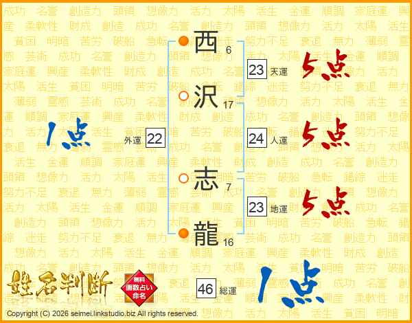 生活面を象徴する運勢です。外部から受ける影響力を表し、結婚運、家庭運や職場、環境への順応性を表します。総運から人運を引いた画数。姓や名が1文字の場合を除く。