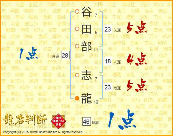 谷田部志龍さんの総運は46画の1点!