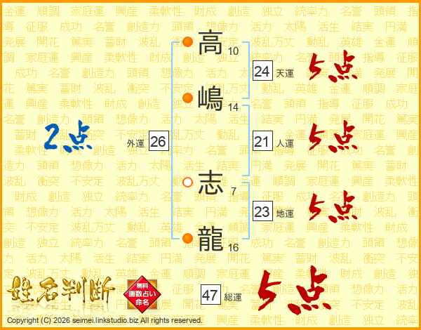 高(10画)嶋(14画) 志(7画)龍(16画)