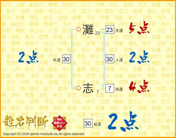 あなたの人生を表す1番重要な運勢です。生涯を通じて影響する総合運となり、主に50歳以降の晩年期に影響を及ぼします。苗字と名前の合計画数。