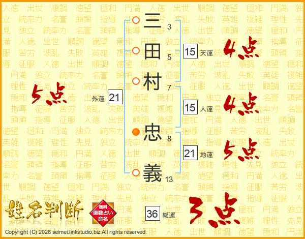 三(3画)田(5画)村(7画) 忠(8画)義(13画)