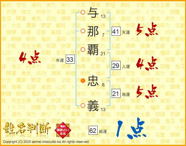与(13画)那(7画)覇(21画) 忠(8画)義(13画)