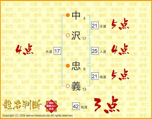 中(4画)沢(17画) 忠(8画)義(13画)