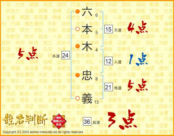 六(6画)本(5画)木(4画) 忠(8画)義(13画)