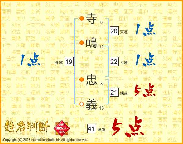 寺(6画)嶋(14画) 忠(8画)義(13画)