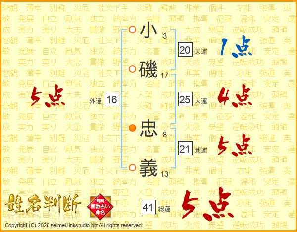生活面を象徴する運勢です。外部から受ける影響力を表し、結婚運、家庭運や職場、環境への順応性を表します。総運から人運を引いた画数。姓や名が1文字の場合を除く。