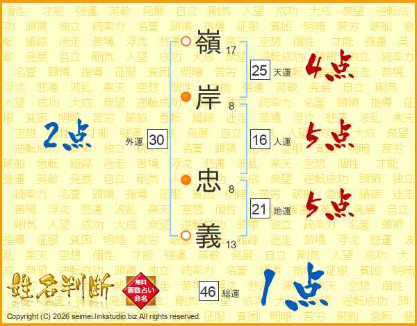 嶺(17画)岸(8画) 忠(8画)義(13画)