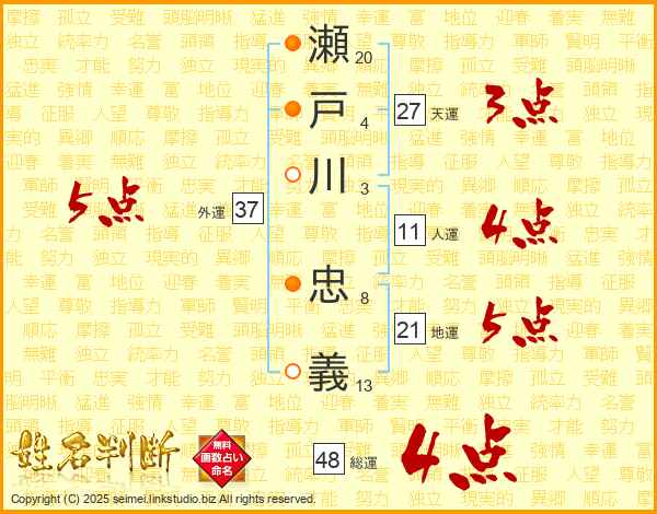 瀬(20画)戸(4画)川(3画) 忠(8画)義(13画)