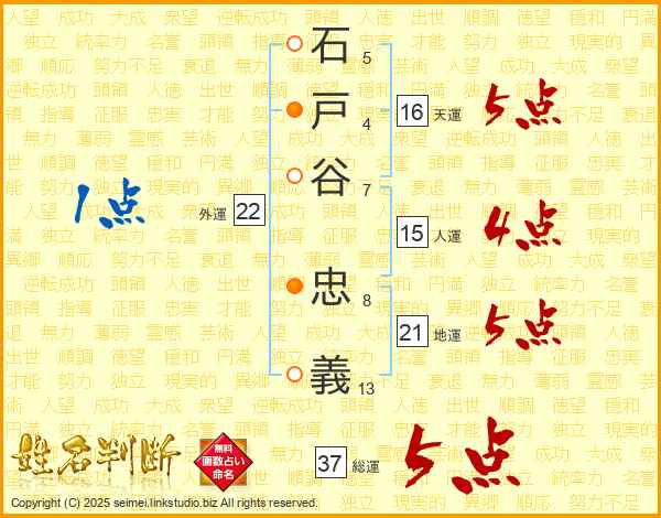 石(5画)戸(4画)谷(7画) 忠(8画)義(13画)