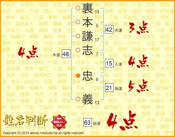 裏本謙志忠義さんの総運は63画の4点!