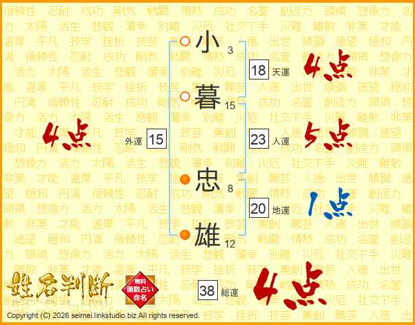 小(3画)暮(15画) 忠(8画)雄(12画)