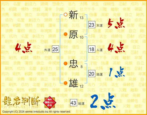 新(13画)原(10画) 忠(8画)雄(12画)