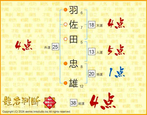 羽(6画)佐(7画)田(5画) 忠(8画)雄(12画)