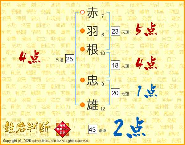 赤(7画)羽(6画)根(10画) 忠(8画)雄(12画)