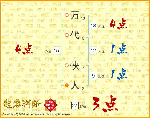 万代快人さんの総運は27画の3点!