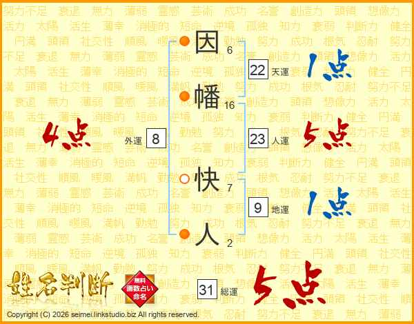 生活面を象徴する運勢です。外部から受ける影響力を表し、結婚運、家庭運や職場、環境への順応性を表します。総運から人運を引いた画数。姓や名が1文字の場合を除く。