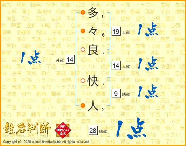 多(6画)々(6画)良(7画) 快(7画)人(2画)