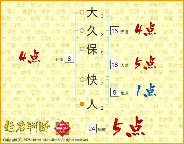 大(3画)久(3画)保(9画) 快(7画)人(2画)