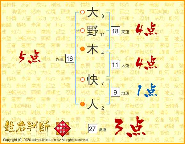 大(3画)野(11画)木(4画) 快(7画)人(2画)