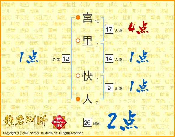 生活面を象徴する運勢です。外部から受ける影響力を表し、結婚運、家庭運や職場、環境への順応性を表します。総運から人運を引いた画数。姓や名が1文字の場合を除く。