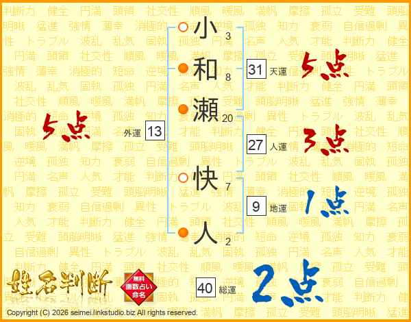 小(3画)和(8画)瀬(20画) 快(7画)人(2画)
