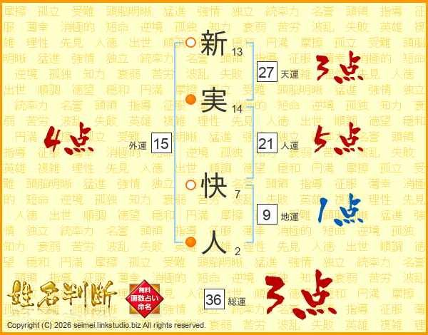 生活面を象徴する運勢です。外部から受ける影響力を表し、結婚運、家庭運や職場、環境への順応性を表します。総運から人運を引いた画数。姓や名が1文字の場合を除く。
