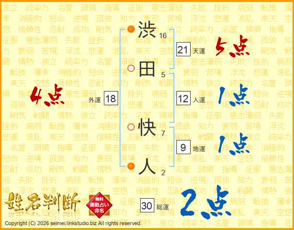 渋(16画)田(5画) 快(7画)人(2画)