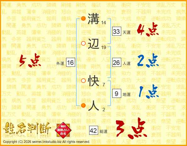 生活面を象徴する運勢です。外部から受ける影響力を表し、結婚運、家庭運や職場、環境への順応性を表します。総運から人運を引いた画数。姓や名が1文字の場合を除く。