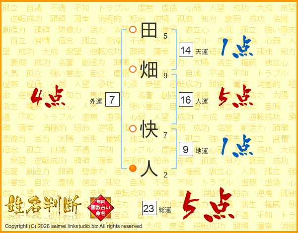 生活面を象徴する運勢です。外部から受ける影響力を表し、結婚運、家庭運や職場、環境への順応性を表します。総運から人運を引いた画数。姓や名が1文字の場合を除く。