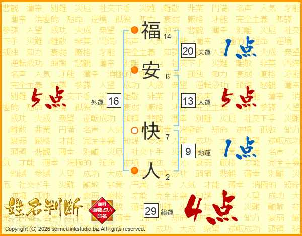 生活面を象徴する運勢です。外部から受ける影響力を表し、結婚運、家庭運や職場、環境への順応性を表します。総運から人運を引いた画数。姓や名が1文字の場合を除く。