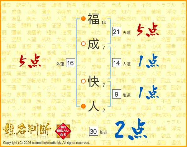 生活面を象徴する運勢です。外部から受ける影響力を表し、結婚運、家庭運や職場、環境への順応性を表します。総運から人運を引いた画数。姓や名が1文字の場合を除く。