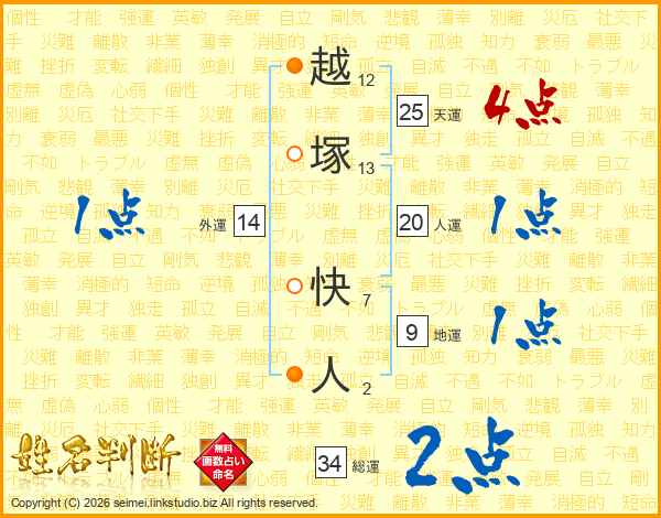 生活面を象徴する運勢です。外部から受ける影響力を表し、結婚運、家庭運や職場、環境への順応性を表します。総運から人運を引いた画数。姓や名が1文字の場合を除く。