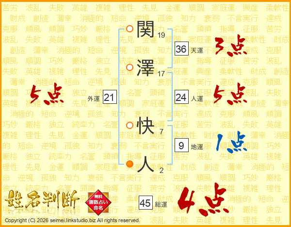 生活面を象徴する運勢です。外部から受ける影響力を表し、結婚運、家庭運や職場、環境への順応性を表します。総運から人運を引いた画数。姓や名が1文字の場合を除く。