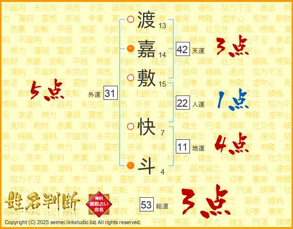 渡(13画)嘉(14画)敷(15画) 快(7画)斗(4画)