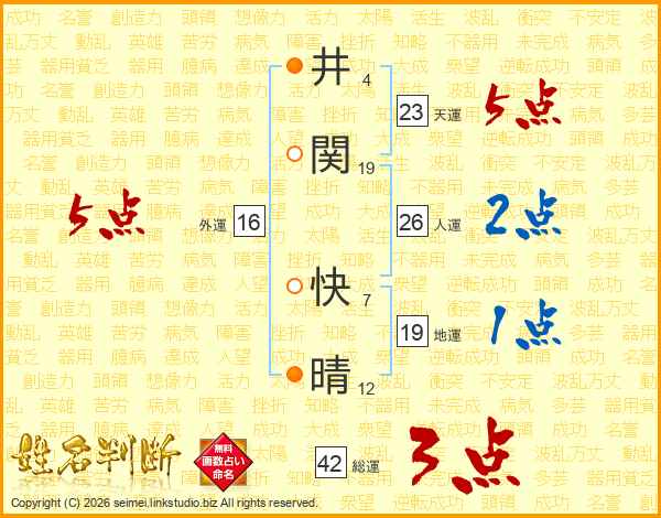 生活面を象徴する運勢です。外部から受ける影響力を表し、結婚運、家庭運や職場、環境への順応性を表します。総運から人運を引いた画数。姓や名が1文字の場合を除く。